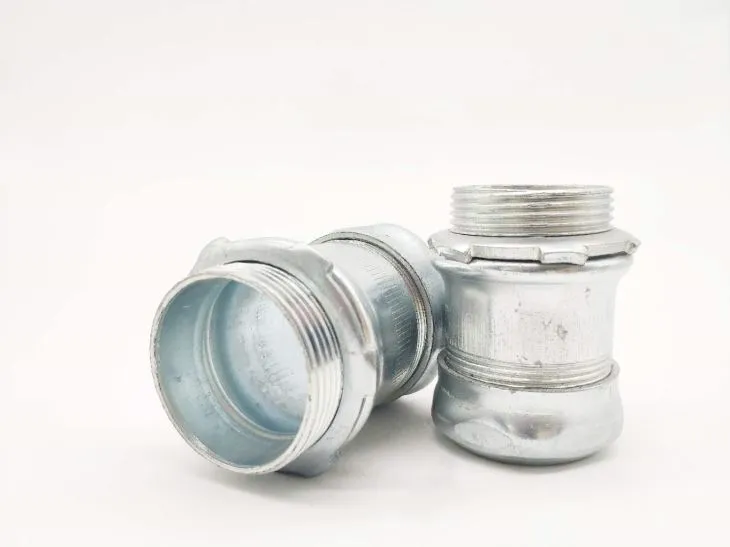 ตัวเชื่อมต่อการบีบอัดใช้เพื่อยึดติดกับท่อร้อยสาย EMT thinwall กับกล่องแยกไฟฟ้าหรือกล่องหุ้ม โครงสร้างเหล็กช่วยให้มั่นใจในการป้องกันเชิงกลและท่อร้อยสายไปยังกล่องแยกไฟฟ้าหรือกล่องหุ้มที่กำหนด ในสถานที่ชื้นตัวเชื่อมต่อการบีบอัดยังมีการป้องกันการกัดกร่อนที่ยอดเยี่ยมด้วย electroplated สังกะสี ด้วยการออกแบบที่ประหยัดแรงงานช่างไฟฟ้าสามารถกระชับขั้วต่อเหล่านี้บนท่อร้อยสาย EMT ได้อย่างรวดเร็ว
